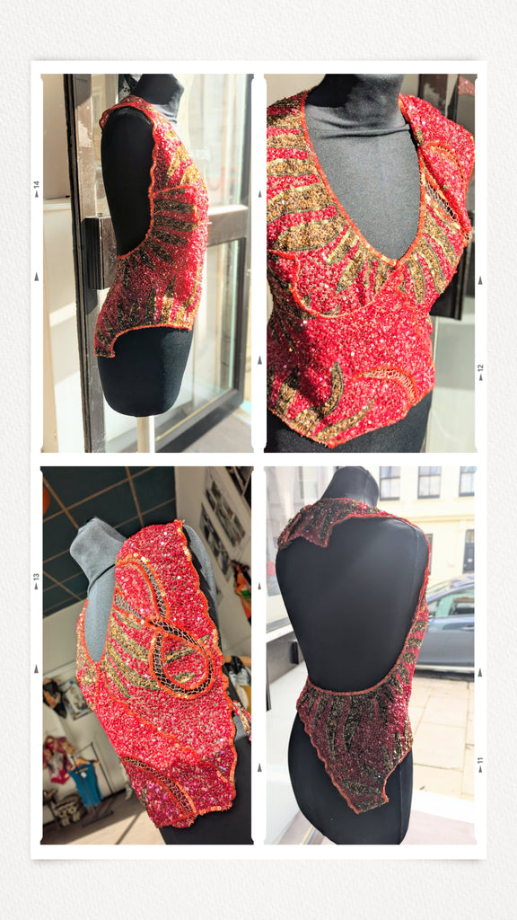 Covered in deep heavy sequins and beads this fabric could only be machine stitched in certain areas and elsewhere had to be shaped, twisted and pleated with extensive hand sewing.